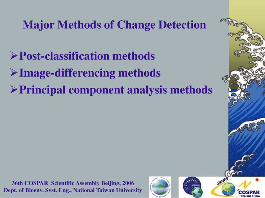 Major Methods of Change Detection • Post-classification methods • Image-differencing methods • Principal component analysis methods 36th COSPAR Scientific Assembly Beijing, 2006 Dept. of Bioenv. Syst. Eng., National Taiwan University