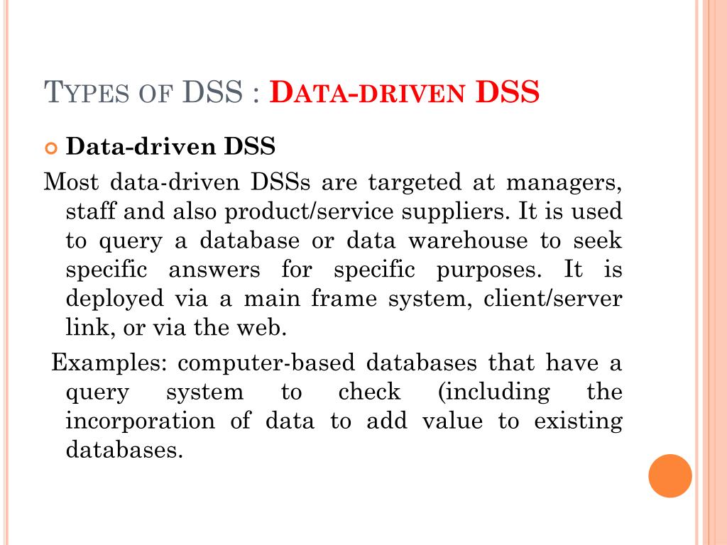 Types of DSS : Data-driven DSS • Data-driven DSS Most data-driven DSSs are targeted at managers, staff and also product/service suppliers. It is used to query a database or data warehouse to seek specific answers for specific purposes. It is deployed via a main frame system, client/server link, or via the web. Examples: computer-based databases that have a query system to check (including the incorporation of data to add value to existing databases.