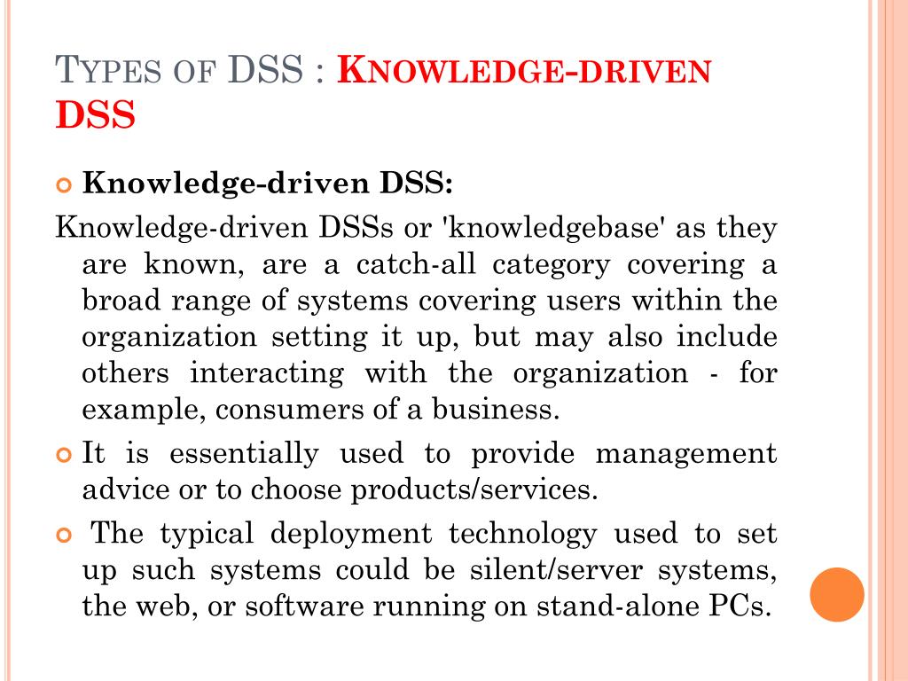 Types of DSS :Knowledge-driven DSS • Knowledge-driven DSS: Knowledge-driven DSSs or 'knowledgebase' as they are known, are a catch-all category covering a broad range of systems covering users within the organization setting it up, but may also include others interacting with the organization - for example, consumers of a business. • It is essentially used to provide management advice or to choose products/services. • The typical deployment technology used to set up such systems could be silent/server systems, the web, or software running on stand-alone PCs.