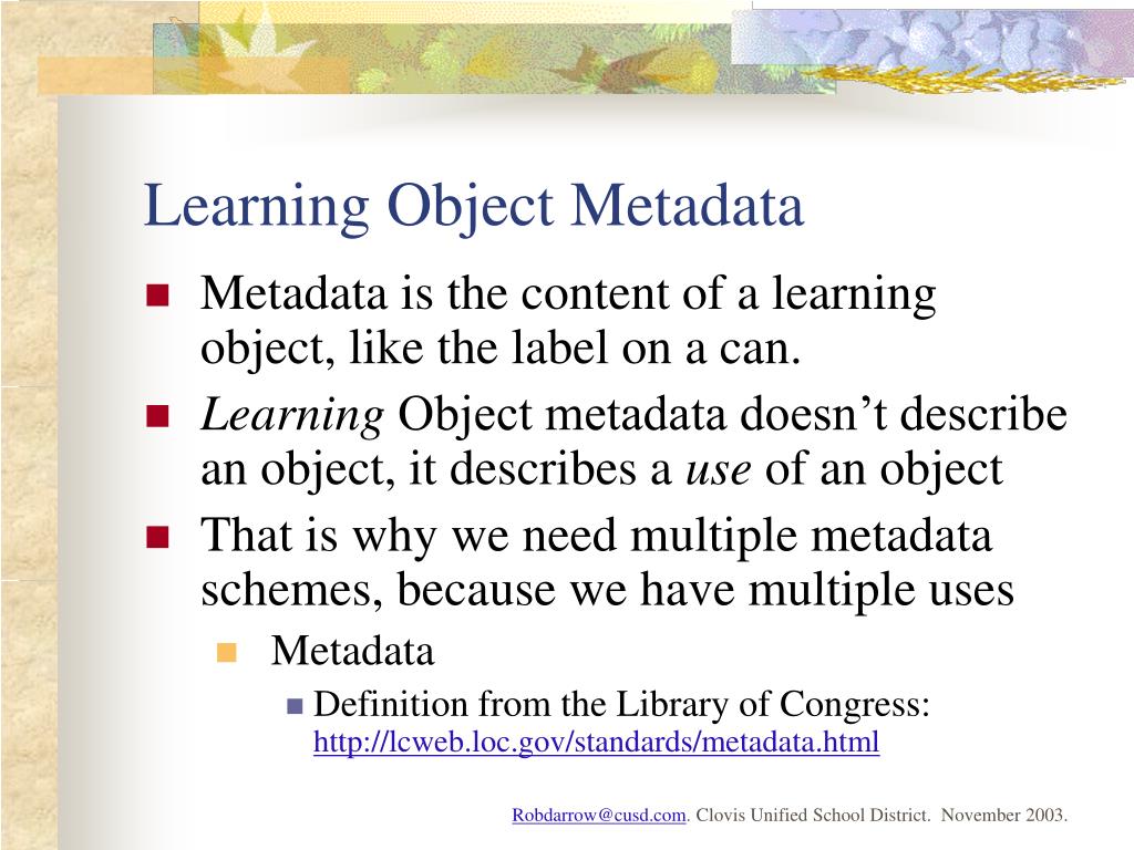 Learning Object Metadata • Metadata is the content of a learning object, like the label on a can. • Learning Object metadata doesn’t describe an object, it describes a use of an object • That is why we need multiple metadata schemes, because we have multiple uses • Metadata • Definition from the Library of Congress: http://lcweb.loc.gov/standards/metadata.html
