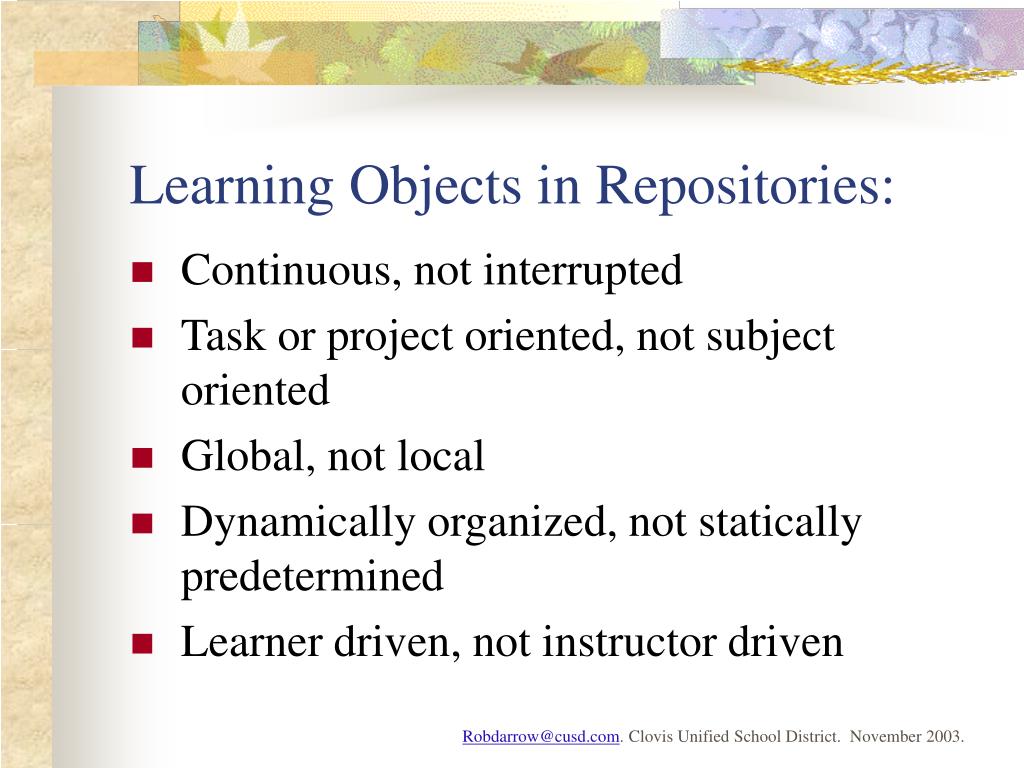 Learning Objects in Repositories: • Continuous, not interrupted • Task or project oriented, not subject oriented • Global, not local • Dynamically organized, not statically predetermined • Learner driven, not instructor driven