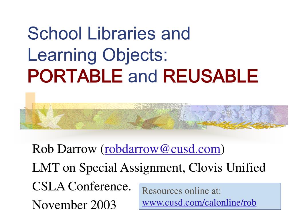School Libraries and Learning Objects: PORTABLE and REUSABLE Rob Darrow (robdarrow@cusd.com) LMT on Special Assignment, Clovis Unified CSLA Conference. November 2003 Resources online at: www.cusd.com/calonline/rob