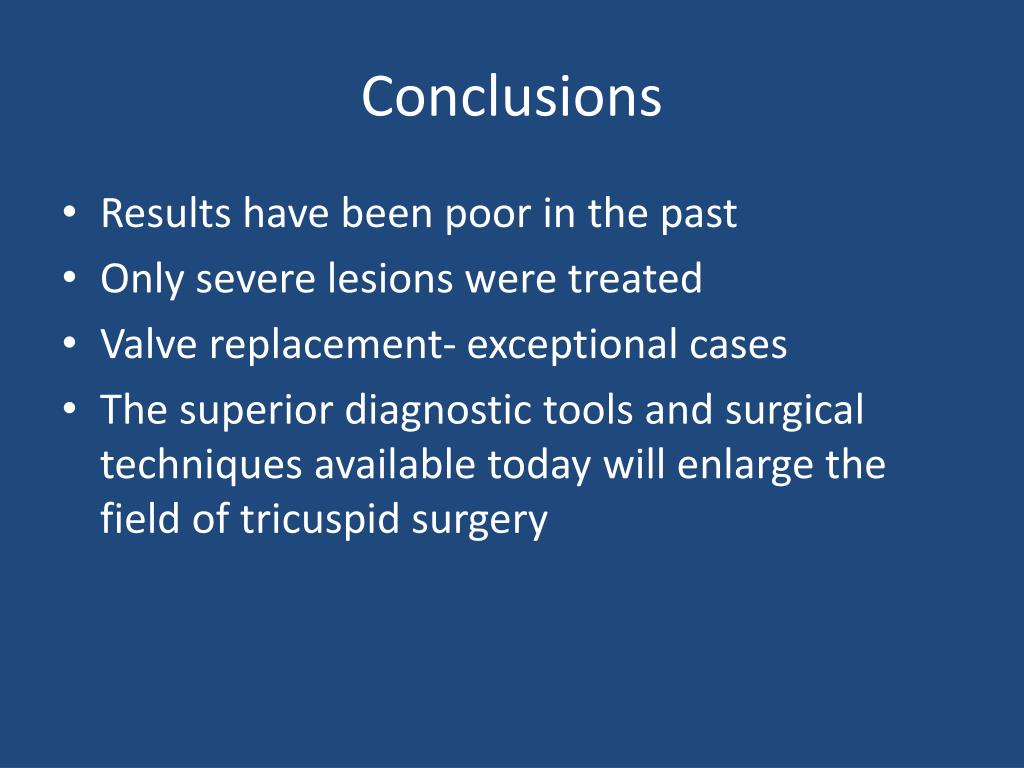 Conclusions • Results have been poor in the past • Only severe lesions were treated • Valve replacement- exceptional cases • The superior diagnostic tools and surgical techniques available today will enlarge the field of tricuspid surgery