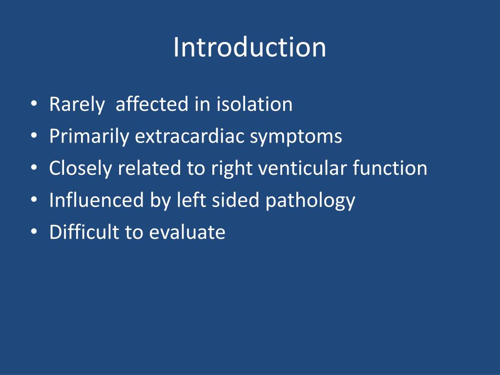 Introduction • Rarely affected in isolation • Primarily extracardiac symptoms • Closely related to right venticular function • Influenced by left sided pathology • Difficult to evaluate