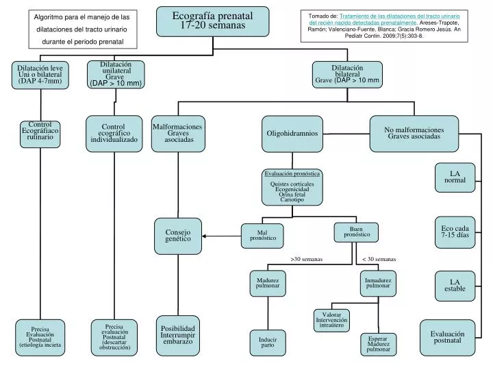 Ecografía prenatal 17-20 semanas. Dilatación unilateral Grave (DAP > 10 mm). Dilatación leve Uni o bilateral (DAP 4-7mm). Dilatación bilateral Grave (DAP > 10 mm. Control ecográfico individualizado. Malformaciones Graves asociadas. No malformaciones Graves asociadas.