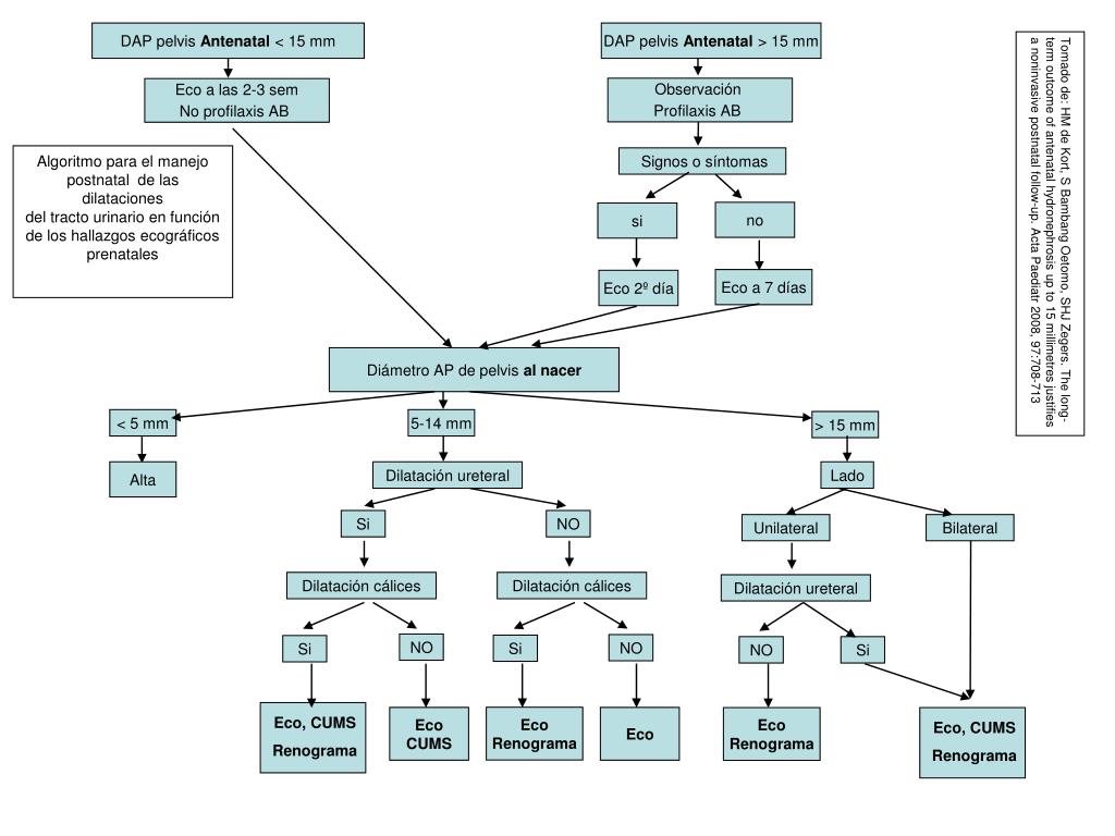 DAP pelvis Antenatal< 15 mm DAP pelvis Antenatal> 15 mm Tomado de: HM de Kort, S Bambang Oetomo, SHJ Zegers. The long-term outcome of antenatal hydronephrosis up to 15 millimetres justifies a noninvasive postnatal follow-up. Acta Paediatr 2008, 97:708-713 Observación Profilaxis AB Eco a las 2-3 sem No profilaxis AB Algoritmo para el manejo postnatal de las dilataciones del tracto urinario en función de los hallazgos ecográficos prenatales Signos o síntomas no si Eco a 7 días Eco 2º día Diámetro AP de pelvis al nacer < 5 mm 5-14 mm > 15 mm Alta Dilatación ureteral Lado Si NO Unilateral Bilateral Dilatación cálices Dilatación cálices Dilatación ureteral NO NO Si Si NO Si Eco, CUMS Renograma Eco Renograma Eco CUMS Eco Eco Renograma Eco, CUMS Renograma