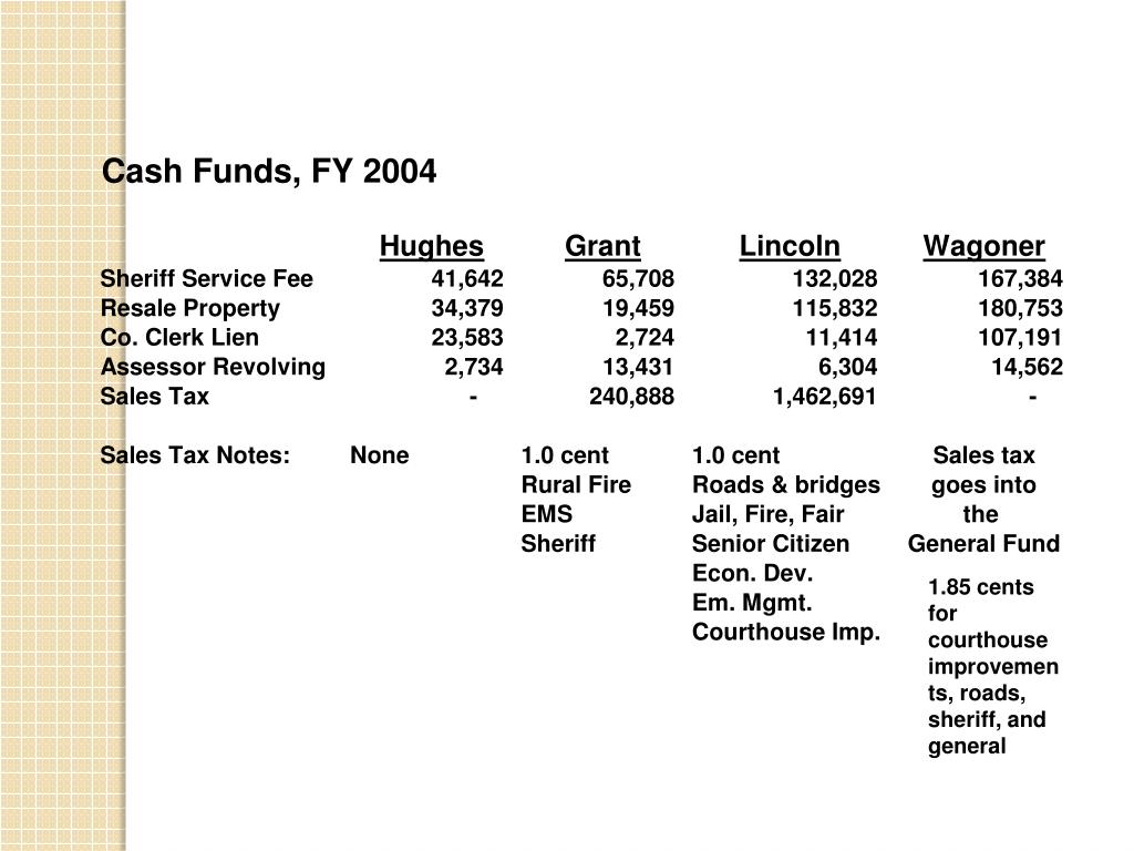 Cash Funds (Special Revenue Funds) • Generally, funded from a fee or limited number of fees • Generally, highly restricted as to use. • e.g. Resale Property Fund – Funded from interest charged for late payment of taxes. Treasurer is to use it for collection of delinquent taxes.