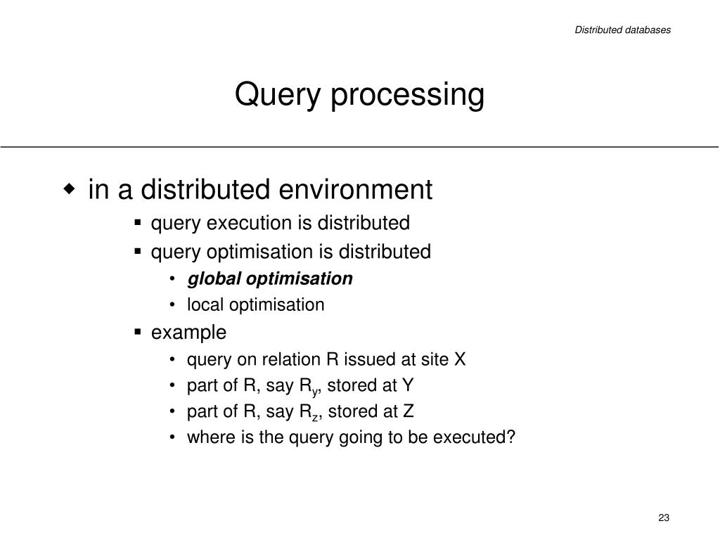 Query processing • in a distributed environment • query execution is distributed • query optimisation is distributed • global optimisation • local optimisation • example • query on relation R issued at site X • part of R, say Ry, stored at Y • part of R, say Rz, stored at Z • where is the query going to be executed?