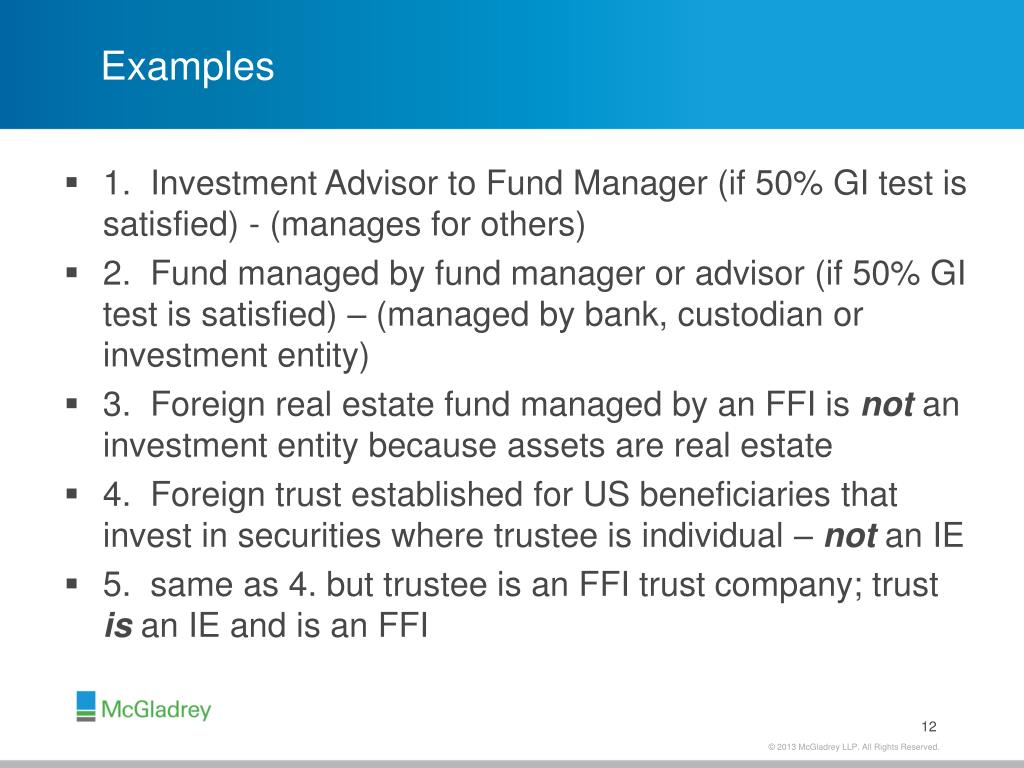 Examples 1. Investment Advisor to Fund Manager (if 50% GI test is satisfied) - (manages for others) 2. Fund managed by fund manager or advisor (if 50% GI test is satisfied) – (managed by bank, custodian or investment entity) 3. Foreign real estate fund managed by an FFI is not an investment entity because assets are real estate 4. Foreign trust established for US beneficiaries that invest in securities where trustee is individual – not an IE 5. same as 4. but trustee is an FFI trust company; trust is an IE and is an FFI