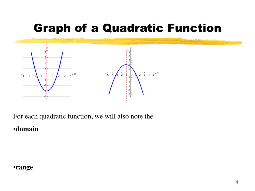 Graph of a Quadratic Function • For each quadratic function, we will also note the • domain • range