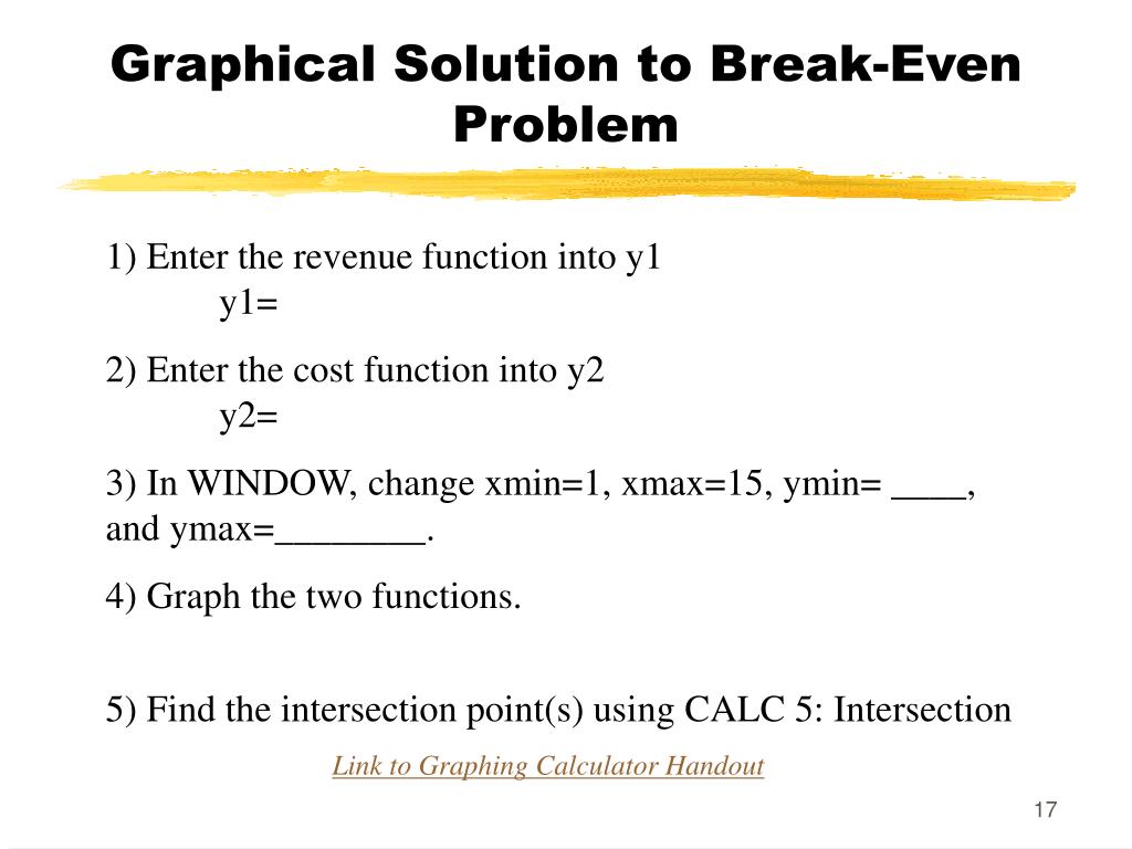 Graphical Solution to Break-Even Problem 1) Enter the revenue function into y1 y1= 2) Enter the cost function into y2 y2= 3) In WINDOW, change xmin=1, xmax=15, ymin= ____, and ymax=________. 4) Graph the two functions. 5) Find the intersection point(s) using CALC 5: Intersection Link to Graphing Calculator Handout