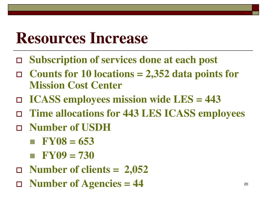 Resources Increase • Subscription of services done at each post • Counts for 10 locations = 2,352 data points for Mission Cost Center • ICASS employees mission wide LES = 443 • Time allocations for 443 LES ICASS employees • Number of USDH • FY08 = 653 • FY09 = 730 • Number of clients = 2,052 • Number of Agencies = 44