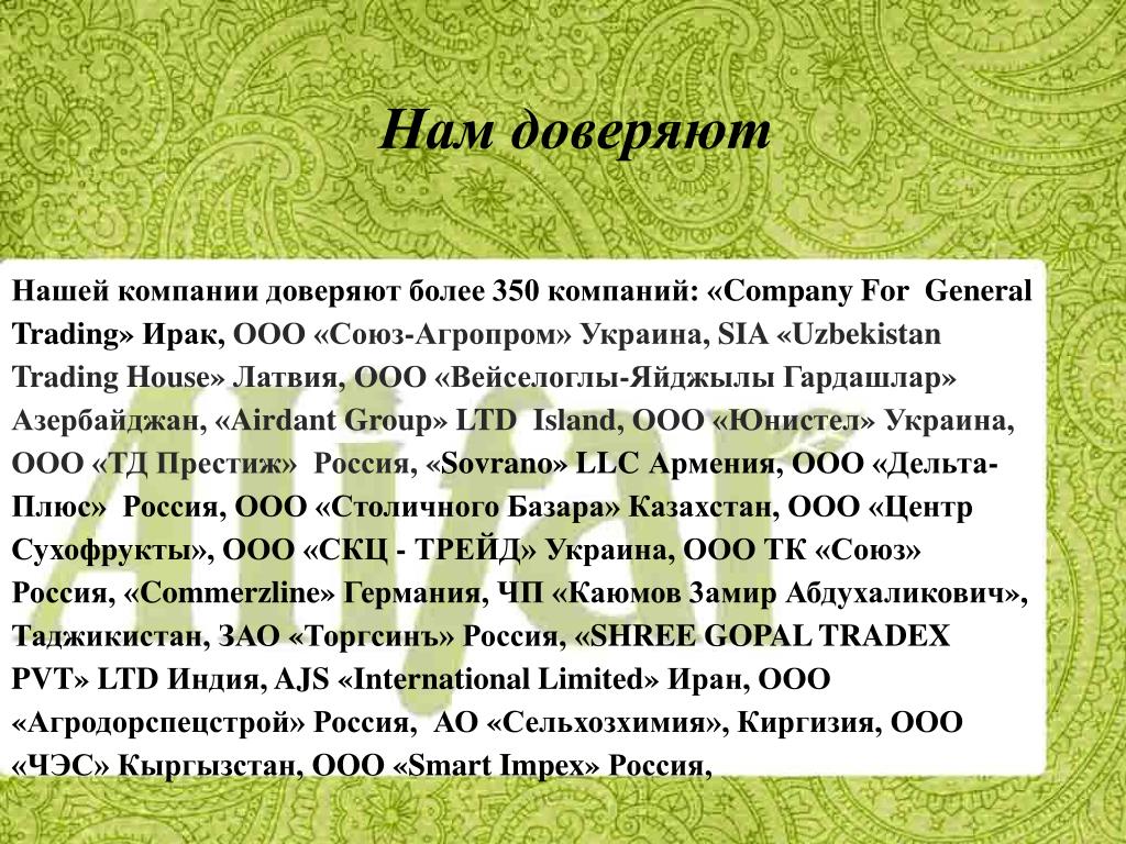 Нам доверяют Нашей компании доверяют более 350 компаний: «Company For General Trading»Ирак, ООО «Союз-Агропром» Украина,SIA «Uzbekistan Trading House» Латвия, ООО «Вейселоглы-ЯйджылыГардашлар»Азербайджан, «Airdant Group»LTD Island, ООО «Юнистел» Украина, ООО «ТД Престиж» Россия, «Sovrano» LLC Армения, ООО «Дельта-Плюс» Россия, ООО «Столичного Базара» Казахстан, ООО «Центр Сухофрукты», ООО «СКЦ - ТРЕЙД» Украина, ООО ТК «Союз» Россия, «Commerzline» Германия, ЧП «Каюмов 3амир Абдухаликович», Таджикистан, ЗАО «Торгсинъ» Россия, «SHREE GOPAL TRADEX PVT» LTD Индия, AJS «International Limited» Иран, ООО «Агродорспецстрой» Россия, АО «Сельхозхимия», Киргизия, ООО «ЧЭС» Кыргызстан, OOO «Smart Impex»Россия,