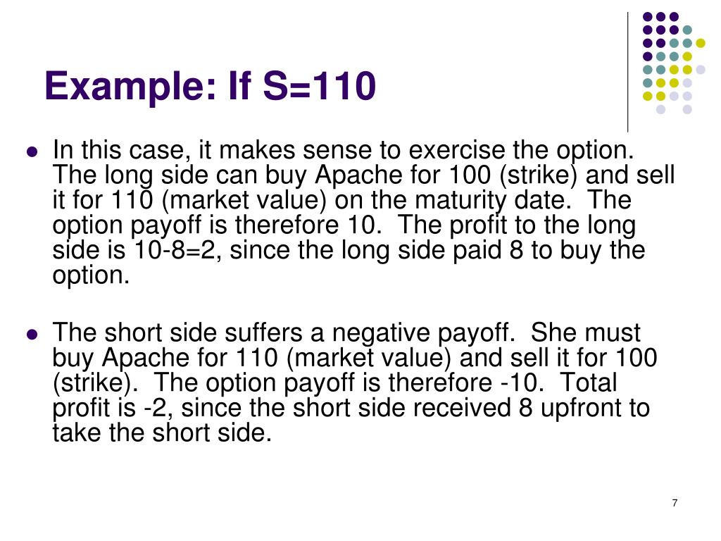 Example: If S=110 • In this case, it makes sense to exercise the option. The long side can buy Apache for 100 (strike) and sell it for 110 (market value) on the maturity date. The option payoff is therefore 10. The profit to the long side is 10-8=2, since the long side paid 8 to buy the option. • The short side suffers a negative payoff. She must buy Apache for 110 (market value) and sell it for 100 (strike). The option payoff is therefore -10. Total profit is -2, since the short side received 8 upfront to take the short side.