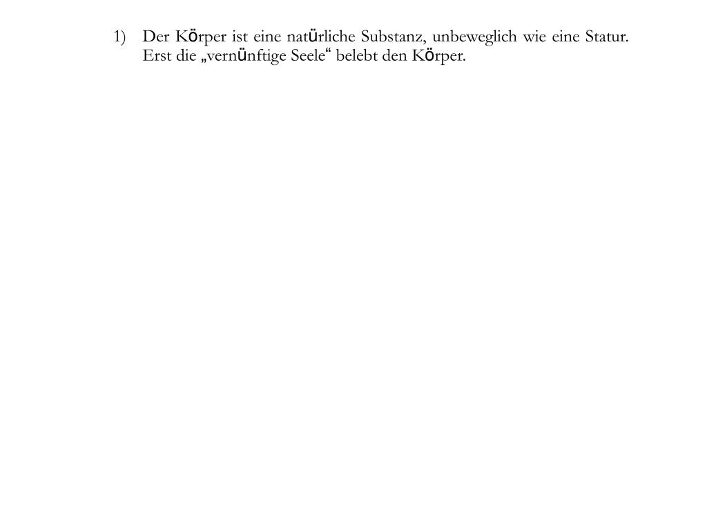 1) Der Körper ist eine natürliche Substanz, unbeweglich wie eine Statur. Erst die „vernünftige Seele“ belebt den Körper.
