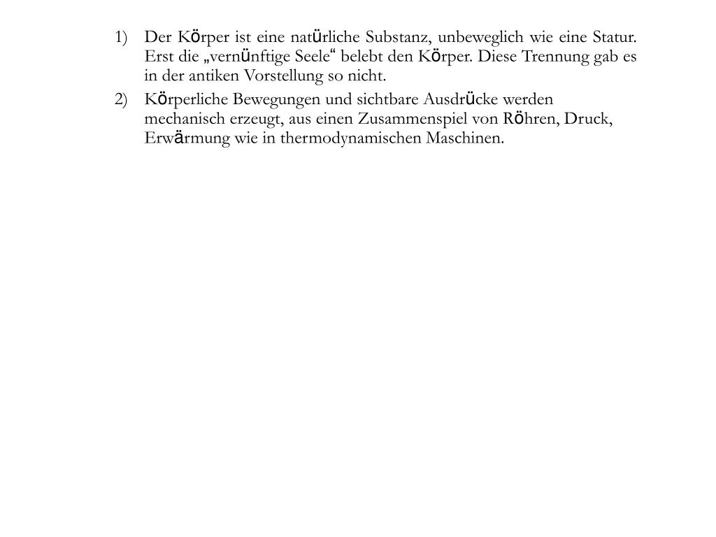 1) Der Körper ist eine natürliche Substanz, unbeweglich wie eine Statur. Erst die „vernünftige Seele“ belebt den Körper. Diese Trennung gab es in der antiken Vorstellung so nicht. 2) Körperliche Bewegungen und sichtbare Ausdrücke werden mechanisch erzeugt, aus einen Zusammenspiel von Röhren, Druck, Erwärmung wie in thermodynamischen Maschinen.