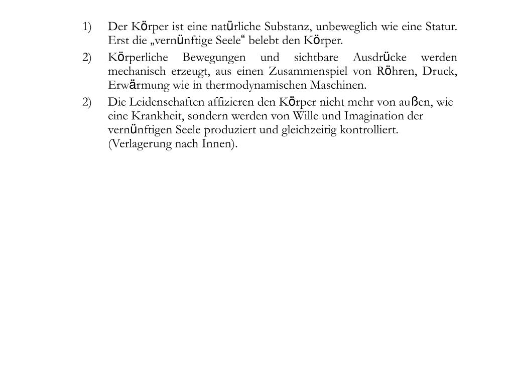 Der Körper ist eine natürliche Substanz, unbeweglich wie eine Statur. Erst die „vernünftige Seele“ belebt den Körper. • Körperliche Bewegungen und sichtbare Ausdrücke werden mechanisch erzeugt, aus einen Zusammenspiel von Röhren, Druck, Erwärmung wie in thermodynamischen Maschinen. • Die Leidenschaften affizieren den Körper nicht mehr von außen, wie eine Krankheit, sondern werden von Wille und Imagination der vernünftigen Seele produziert und gleichzeitig kontrolliert. (Verlagerung nach Innen).