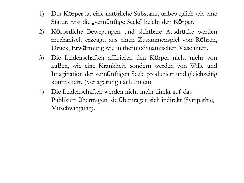 1) Der Körper ist eine natürliche Substanz, unbeweglich wie eine Statur. Erst die „vernünftige Seele“ belebt den Körper. • Körperliche Bewegungen und sichtbare Ausdrücke werden mechanisch erzeugt, aus einen Zusammenspiel von Röhren, Druck, Erwärmung wie in thermodynamischen Maschinen. • Die Leidenschaften affizieren den Körper nicht mehr von außen, wie eine Krankheit, sondern werden von Wille und Imagination der vernünftigen Seele produziert und gleichzeitig kontrolliert. (Verlagerung nach Innen). • Die Leidenschaften werden nicht mehr direkt auf das Publikum übertragen, sie übertragen sich indirekt (Sympathie, Mitschwingung). • Geist und Körper stehen in einem psycho-physichen Dualismus. Der Geist kann den Körper in emotionale Zustände bringen, umgekehrt erzeugen körperliche Bewegungen bestimmte emotionale Vorstellungen.