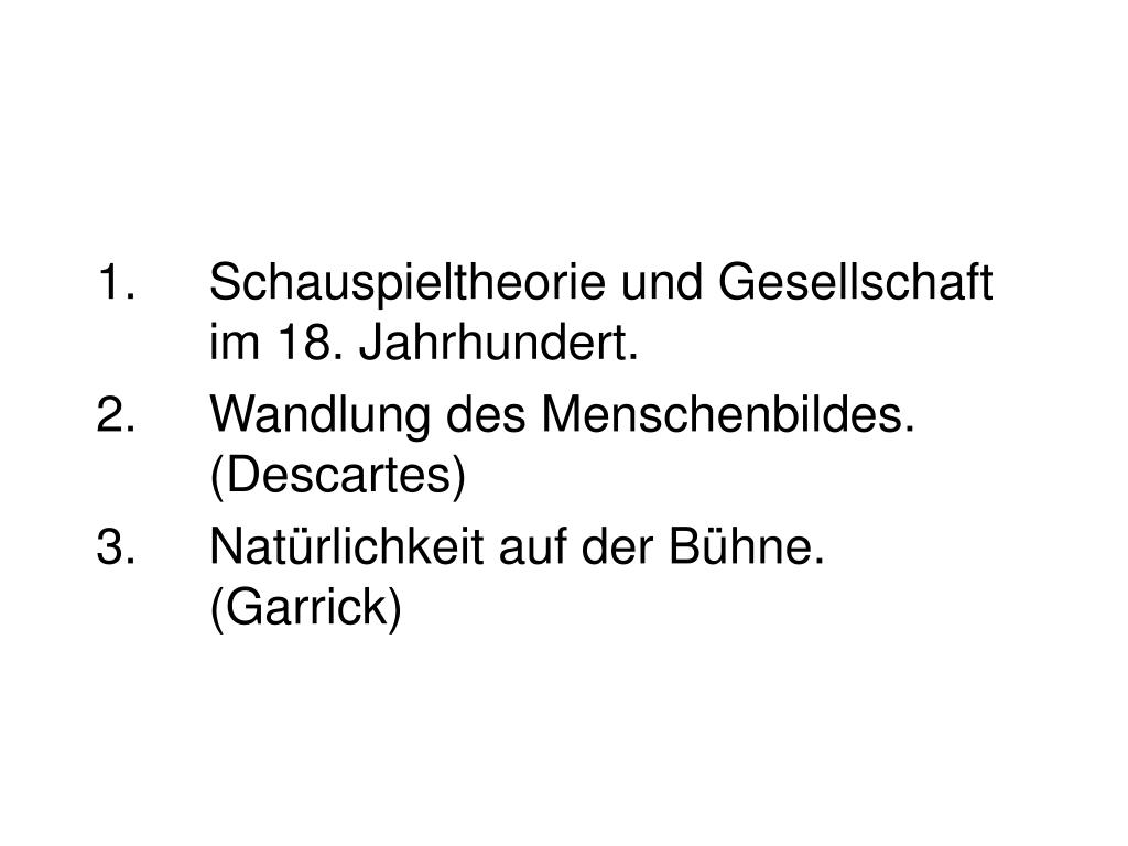 1. Schauspieltheorie und Gesellschaft im 18. Jahrhundert. 2. Wandlung des Menschenbildes. (Descartes) 3. Natürlichkeit auf der Bühne. (Garrick)