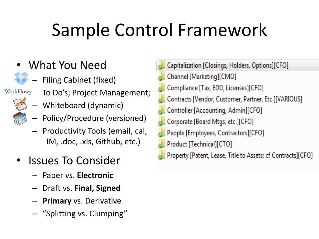 Sample Control Framework • What You Need • Filing Cabinet (fixed) • To Do’s; Project Management; • Whiteboard (dynamic) • Policy/Procedure (versioned) • Productivity Tools (email, cal, IM, .doc, .xls, Github, etc.) • Issues To Consider • Paper vs. Electronic • Draft vs. Final, Signed • Primary vs. Derivative • “Splitting vs. Clumping”