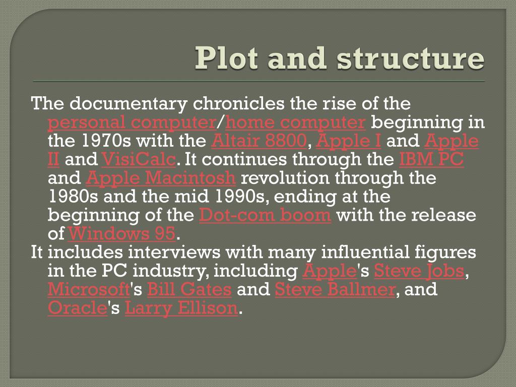 Plot and structure The documentary chronicles the rise of the personal computer/home computer beginning in the 1970s with the Altair 8800, Apple I and Apple II and VisiCalc. It continues through the IBM PC and Apple Macintosh revolution through the 1980s and the mid 1990s, ending at the beginning of the Dot-com boom with the release of Windows 95. It includes interviews with many influential figures in the PC industry, including Apple's Steve Jobs, Microsoft's Bill Gates and Steve Ballmer, and Oracle's Larry Ellison.