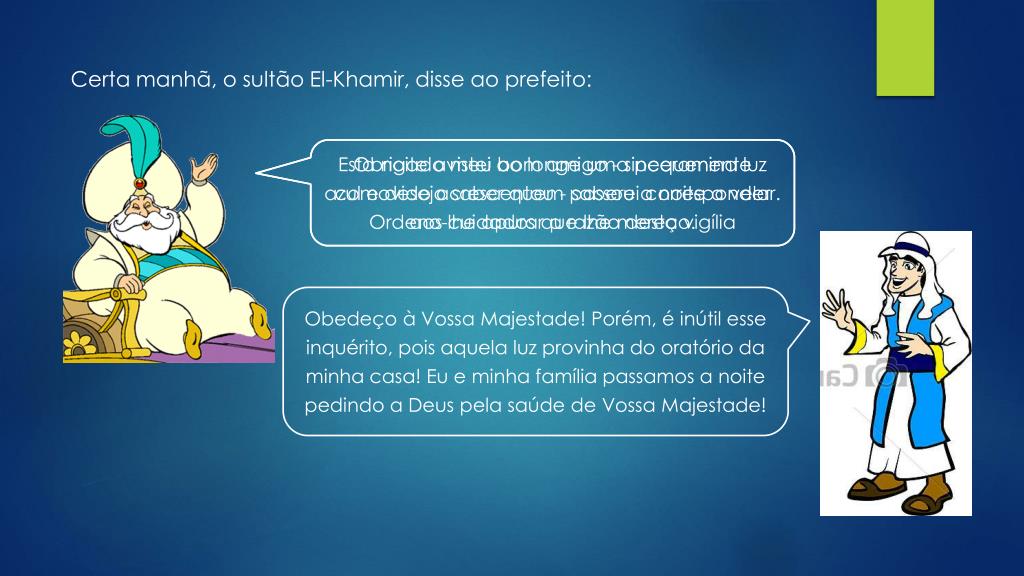 Certa manhã, o sultão El-Khamir, disse ao prefeito: Esta noite avistei ao longe uma pequenina luz azul e desejo saber quem passou a noite a velar. Ordeno-lhe apurar a razão desta vigília Obrigado meu bom amigo - sinceramente comovido acrescentou - saberei corresponder aos cuidados que lhe mereço. Obedeço à Vossa Majestade! Porém, é inútil esse inquérito, pois aquela luz provinha do oratório da minha casa! Eu e minha família passamos a noite pedindo a Deus pela saúde de Vossa Majestade!