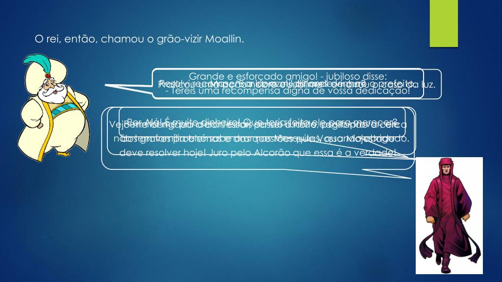 O rei, então, chamou o grão-vizir Moallin. Grande e esforçado amigo! - jubiloso disse:- Tereis uma recompensa digna de vossa dedicação! Resolvi recompensar com mil dinares de ouro o prefeito. Mas... E a luz azul, de onde vinha? Praticou uma ação nobre e sublime - e narrou o caso da luz. Vejo-me obrigado a confessar, passei a noite cogitando a cerca dos graves problemas e das questões que Vossa Majestade deve resolver hoje! Juro pelo Alcorão que essa é a verdade! Permita-me ponderar, estais sendo iludido, posso provar, ele não tem família e só sabe orar nas Mesquitas, quando obrigado. Por Alá! É muito dinheiro! Que teria feito ele para merecer?