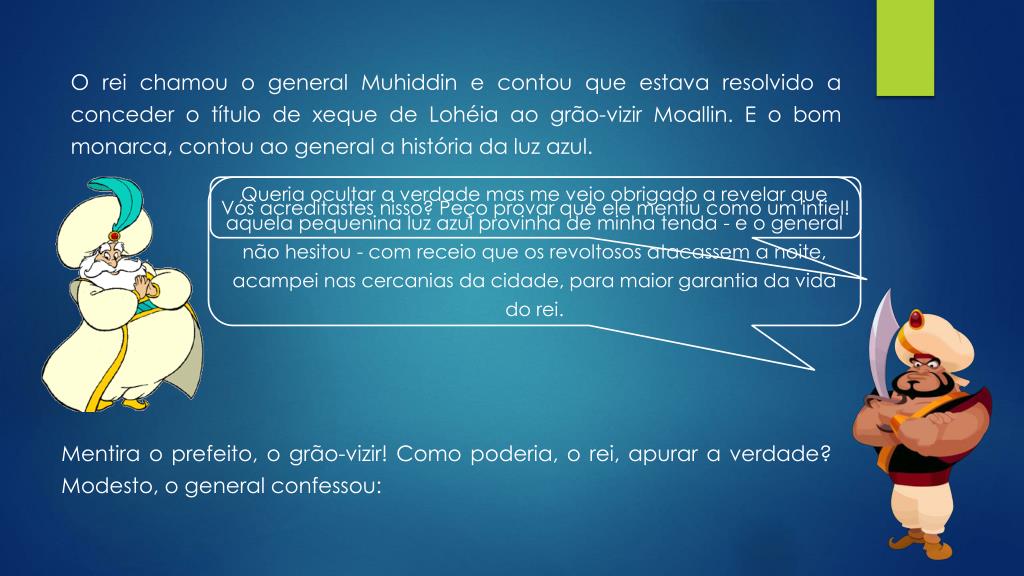 O rei chamou o general Muhiddin e contou que estava resolvido a conceder o título de xeque de Lohéia ao grão-vizir Moallin. E o bom monarca, contou ao general a história da luz azul. Queria ocultar a verdade mas me vejo obrigado a revelar que aquela pequenina luz azul provinha de minha tenda - e o general não hesitou - com receio que os revoltosos atacassem a noite, acampei nas cercanias da cidade, para maior garantia da vida do rei. Vós acreditastes nisso? Peço provar que ele mentiu como um infiel! Mentira o prefeito, o grão-vizir! Como poderia, o rei, apurar a verdade? Modesto, o general confessou: