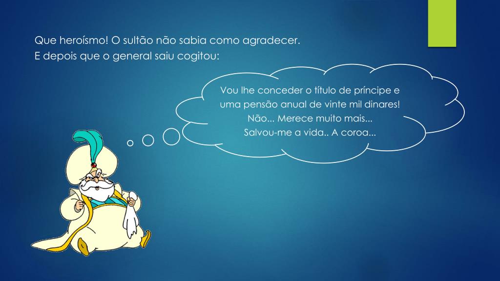 Que heroísmo! O sultão não sabia como agradecer. E depois que o general saiu cogitou: Vou lhe conceder o título de príncipe e uma pensão anual de vinte mil dinares! Não... Merece muito mais... Salvou-me a vida.. A coroa...