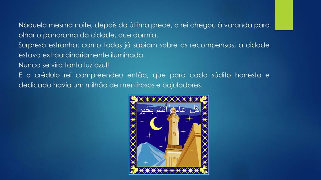 Naquela mesma noite, depois da última prece, o rei chegou à varanda para olhar o panorama da cidade, que dormia. Surpresa estranha: como todos já sabiam sobre as recompensas, a cidade estava extraordinariamente iluminada. Nunca se vira tanta luz azul! E o crédulo rei compreendeu então, que para cada súdito honesto e dedicado havia um milhão de mentirosos e bajuladores.