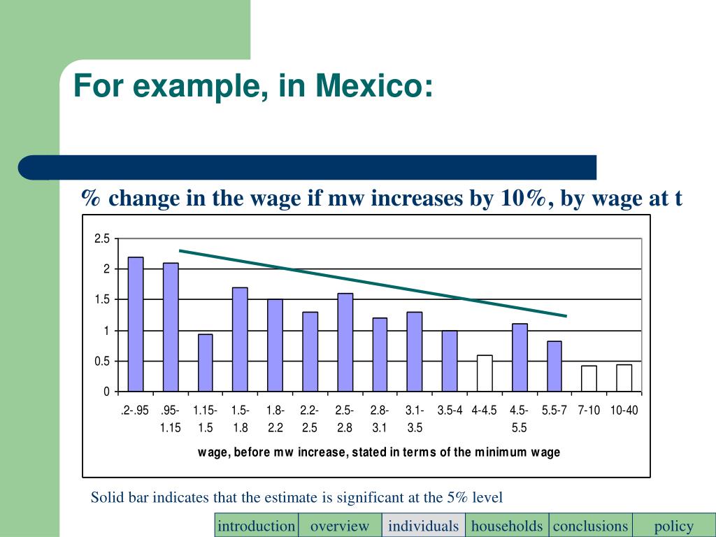 For example, in Mexico: % change in the wage if mw increases by 10%, by wage at t Solid bar indicates that the estimate is significant at the 5% level introduction overview individuals households conclusions policy