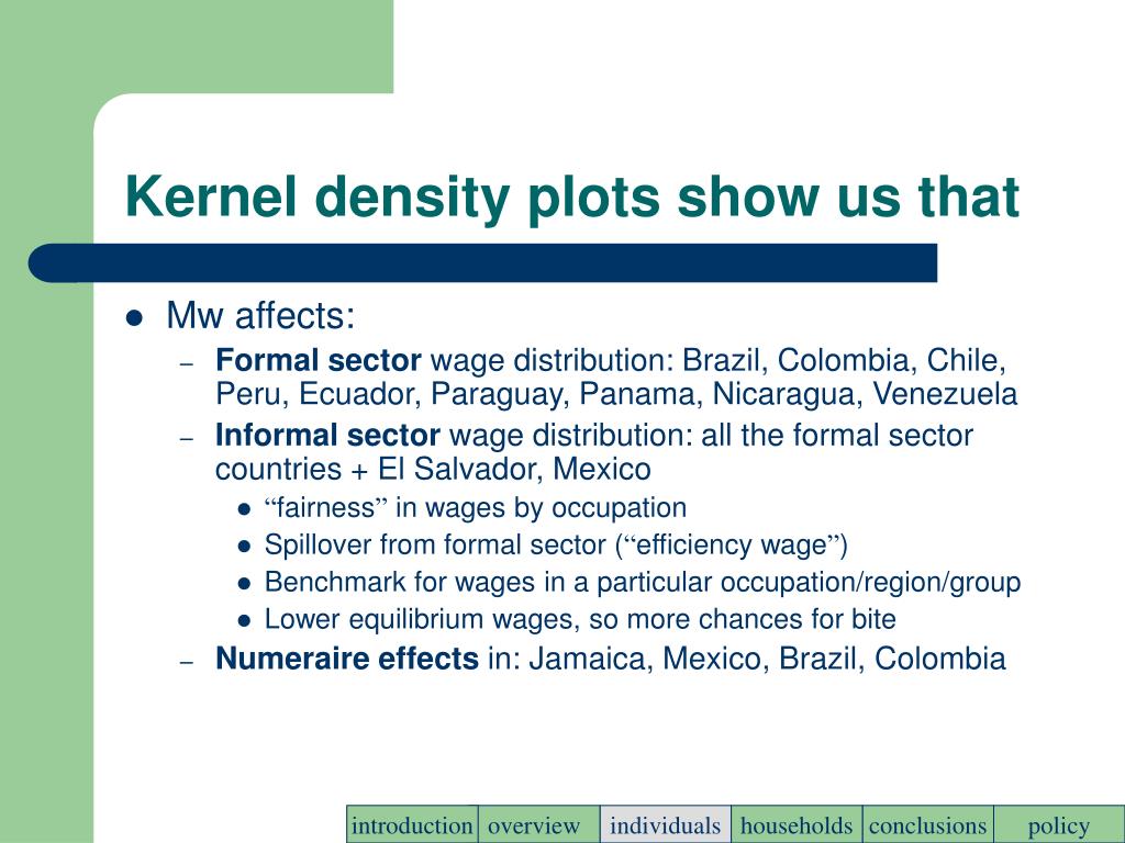 Kernel density plots show us that • Mw affects: • Formal sector wage distribution: Brazil, Colombia, Chile, Peru, Ecuador, Paraguay, Panama, Nicaragua, Venezuela • Informal sector wage distribution: all the formal sector countries + El Salvador, Mexico • “fairness” in wages by occupation • Spillover from formal sector (“efficiency wage”) • Benchmark for wages in a particular occupation/region/group • Lower equilibrium wages, so more chances for bite • Numeraire effects in: Jamaica, Mexico, Brazil, Colombia introduction overview individuals households conclusions policy
