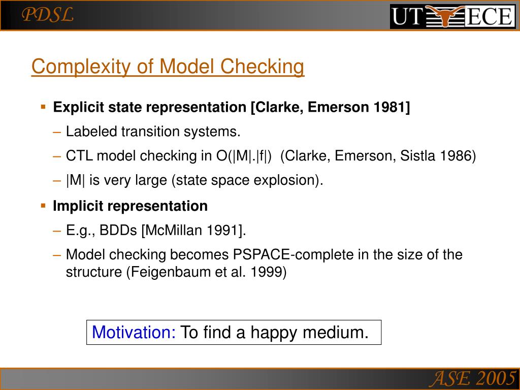 Complexity of Model Checking • Explicit state representation [Clarke, Emerson 1981] • Labeled transition systems. • CTL model checking in O(|M|.|f|) (Clarke, Emerson, Sistla 1986) • |M| is very large (state space explosion). • Implicit representation • E.g., BDDs [McMillan 1991]. • Model checking becomes PSPACE-complete in the size of the structure (Feigenbaum et al. 1999) Motivation: To find a happy medium.