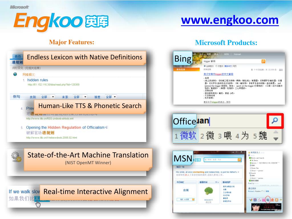 www.engkoo.com Major Features: Microsoft Products: Endless Lexicon with Native Definitions Bing Human-Like TTS & Phonetic Search Office State-of-the-Art Machine Translation (NIST OpenMT Winner) MSN Real-time Interactive Alignment