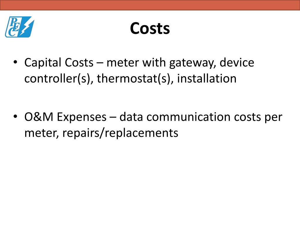 Costs • Capital Costs – meter with gateway, device controller(s), thermostat(s), installation • O&M Expenses – data communication costs per meter, repairs/replacements