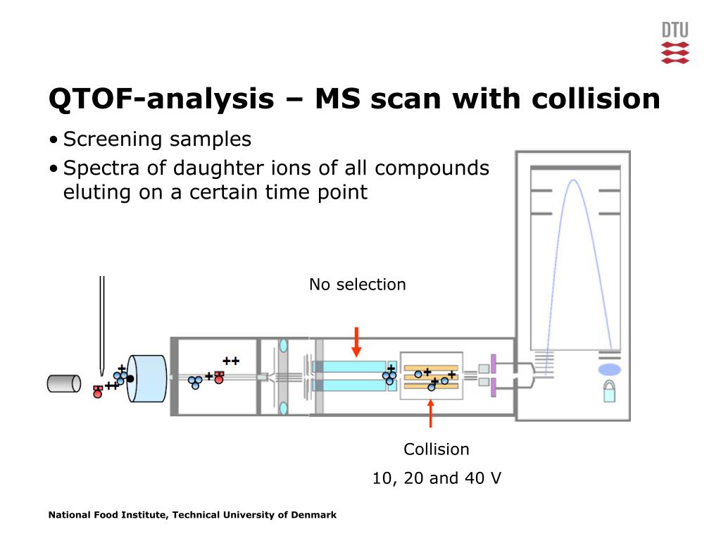 QTOF-analysis – MS scan with collision • Screening samples • Spectra of daughter ions of all compoundseluting on a certain time point No selection Collision 10, 20 and 40 V