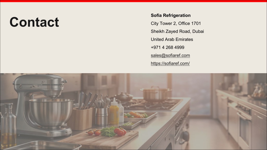 Sofia Refrigeration Contact City Tower 2, Office 1701 Sheikh Zayed Road, Dubai United Arab Emirates +971 4 268 4999 sales@sofiaref.com https://sofiaref.com/