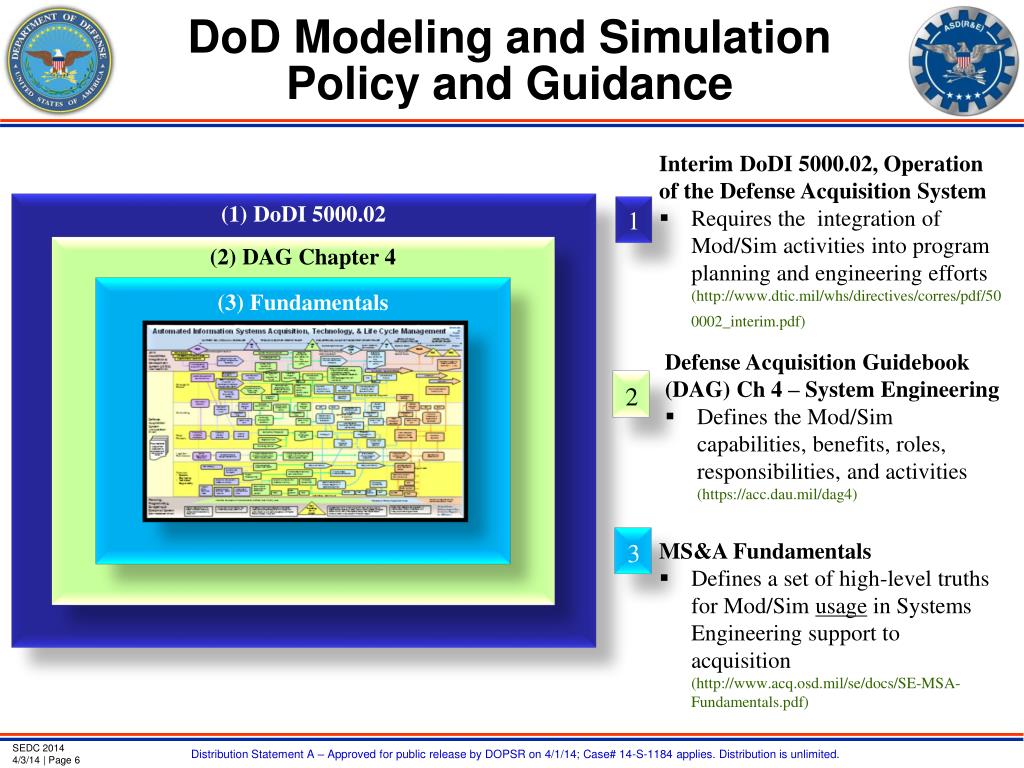 DoD Modeling and Simulation Policy and Guidance • Interim DoDI 5000.02, Operation of the Defense Acquisition System • Requires the integration of Mod/Sim activities into program planning and engineering efforts (http://www.dtic.mil/whs/directives/corres/pdf/500002_interim.pdf) (1) DoDI 5000.02 1 (2) DAG Chapter 4 (3) Fundamentals • Defense Acquisition Guidebook (DAG) Ch 4 – System Engineering • Defines the Mod/Sim capabilities, benefits, roles, responsibilities, and activities (https://acc.dau.mil/dag4) 2 • MS&A Fundamentals • Defines a set of high-level truths for Mod/Sim usage in Systems Engineering support to acquisition (http://www.acq.osd.mil/se/docs/SE-MSA-Fundamentals.pdf) 3