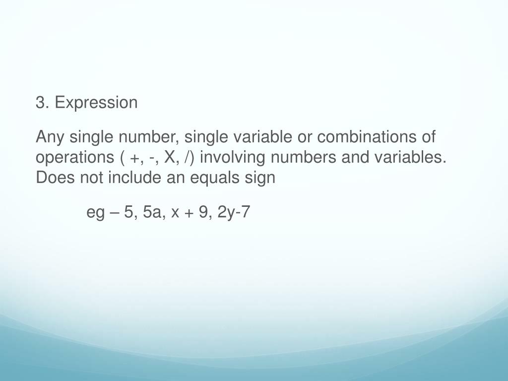 3. Expression Any single number, single variable or combinations of operations ( +, -, X, /) involving numbers and variables. Does not include an equals sign eg – 5, 5a, x + 9, 2y-7
