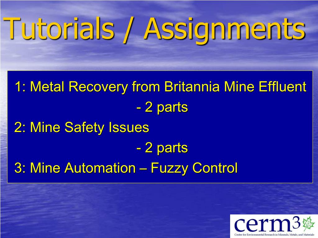 Tutorials / Assignments 1: Metal Recovery from Britannia Mine Effluent - 2 parts 2: Mine Safety Issues - 2 parts 3: Mine Automation – Fuzzy Control