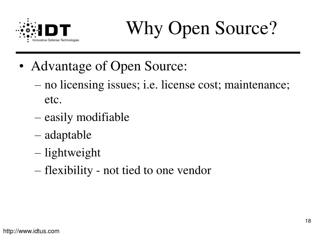 Why Open Source? Advantage of Open Source: no licensing issues; i.e. license cost; maintenance; etc. easily modifiable adaptable lightweight flexibility - not tied to one vendor
