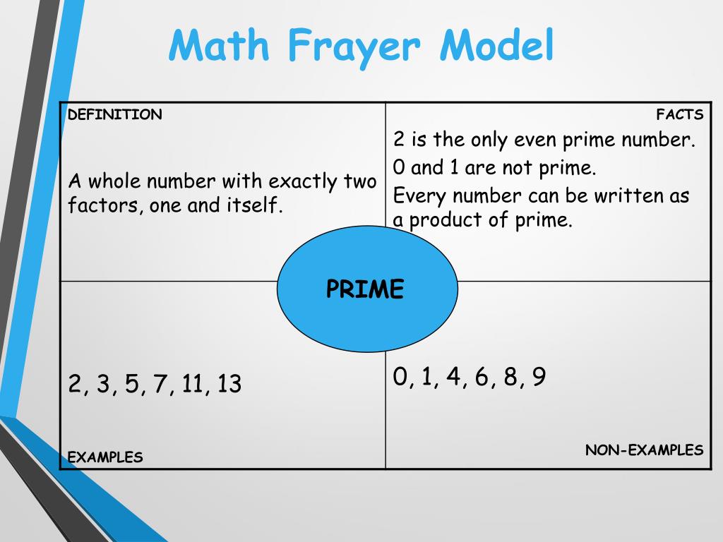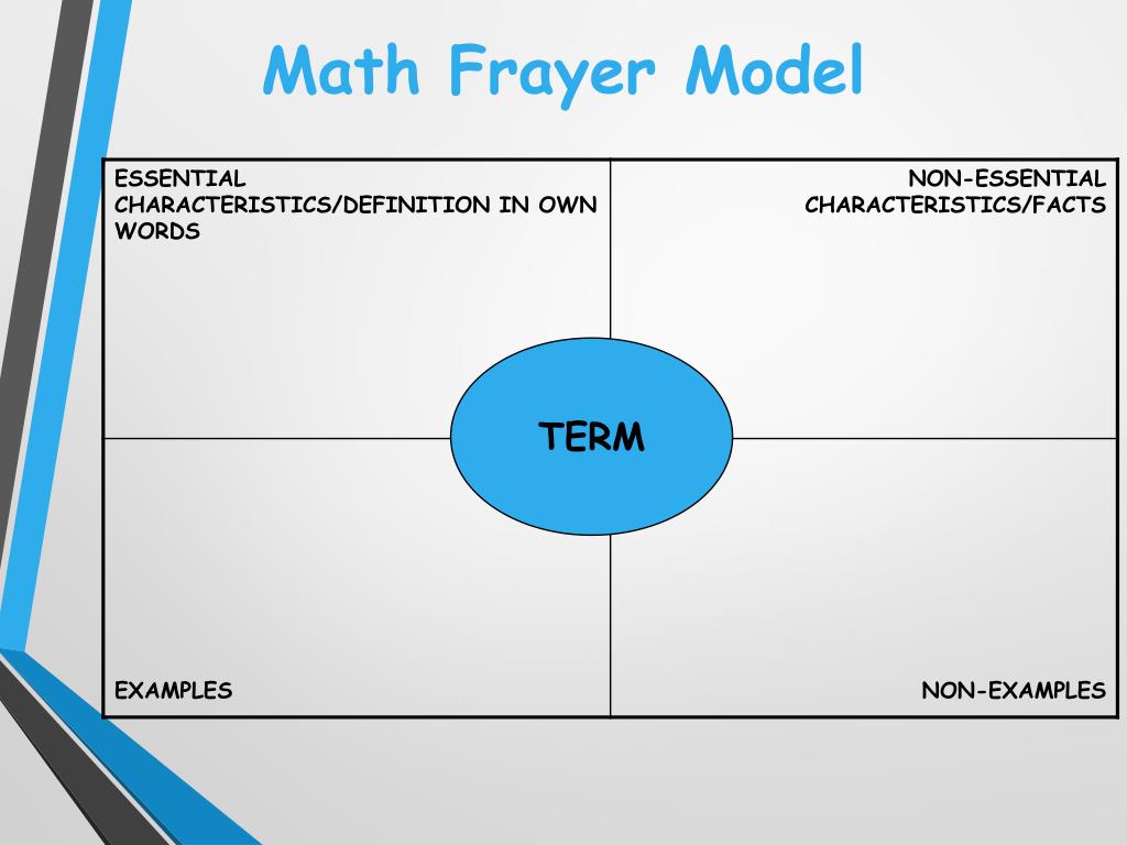 Frayer Model • Vocabulary strategy – supports learning vocabulary terms • Definition in own words • Essential characteristics • Non-essential characteristics • Examples • Non-examples