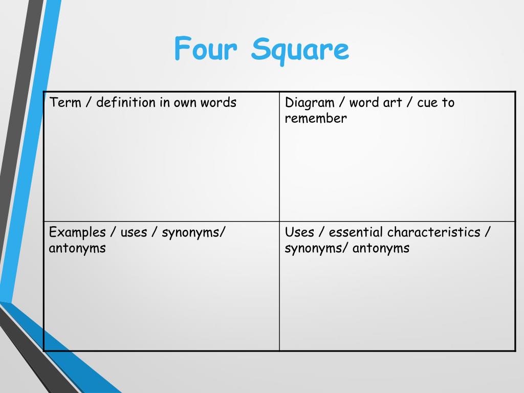 Four Square • Vocabulary strategy – supports learning vocabulary terms • Definition in own terms • Drawings • Synonyms/Antonyms • Connections • Examples • Essential characteristics • Symbols