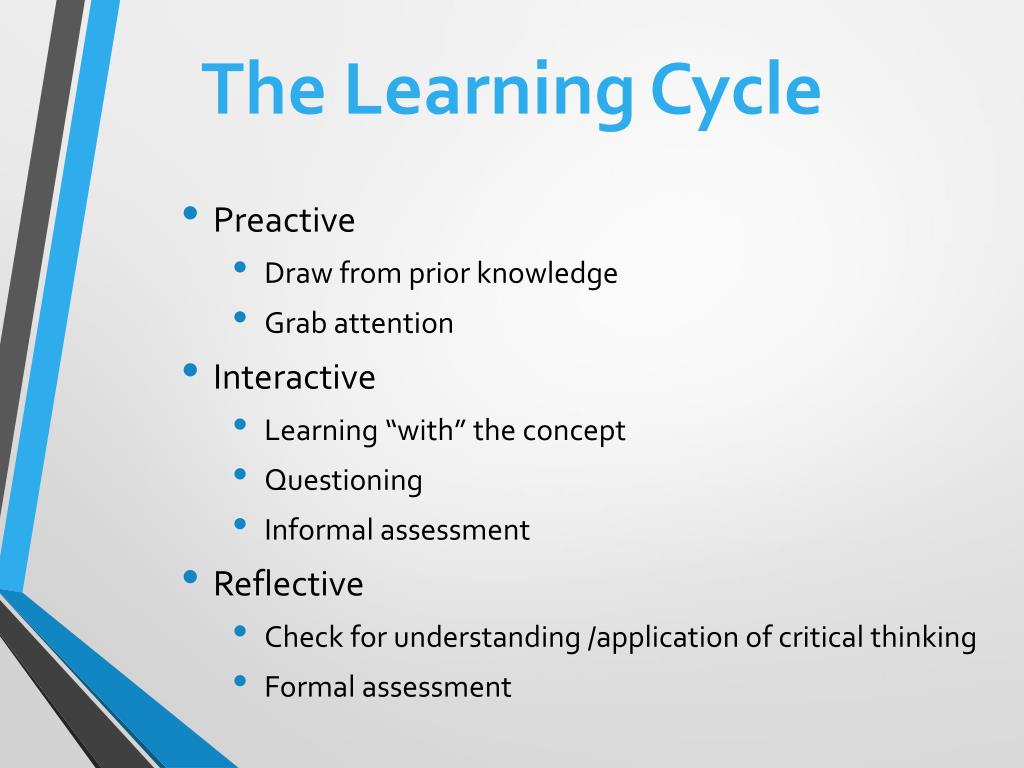 The Learning Cycle • Preactive • Draw from prior knowledge • Grab attention • Interactive • Learning “with” the concept • Questioning • Informal assessment • Reflective • Check for understanding /application of critical thinking • Formal assessment