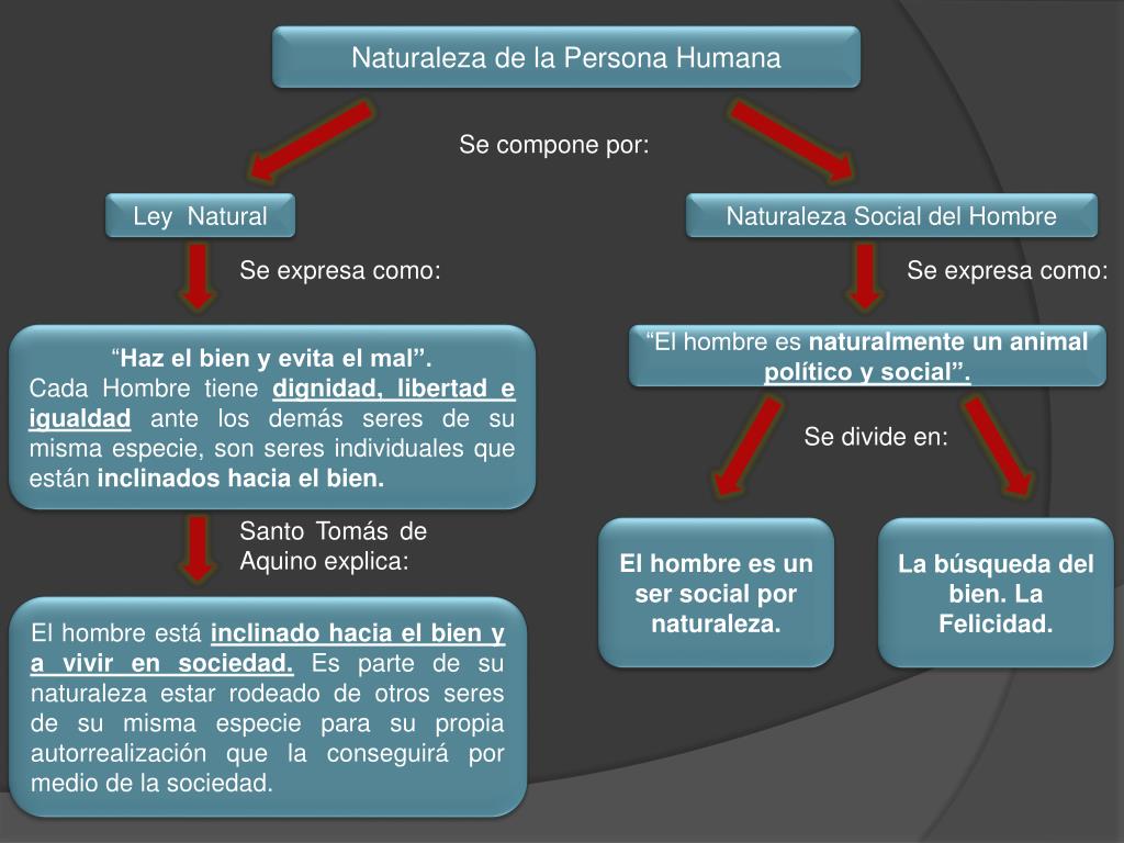 Naturaleza de la Persona Humana Se compone por: Se divide en: Santo Tomás de Aquino explica: Ley Natural Naturaleza Social del Hombre Se expresa como: Se expresa como: “Haz el bien y evita el mal”. Cada Hombre tiene dignidad, libertad e igualdad ante los demás seres de su misma especie, son seres individuales que están inclinados hacia el bien. “El hombre es naturalmente un animal político y social”. El hombre es un ser social por naturaleza. La búsqueda del bien. La Felicidad. El hombre está inclinado hacia el bien y a vivir en sociedad. Es parte de su naturaleza estar rodeado de otros seres de su misma especie para su propia autorrealización que la conseguirá por medio de la sociedad.
