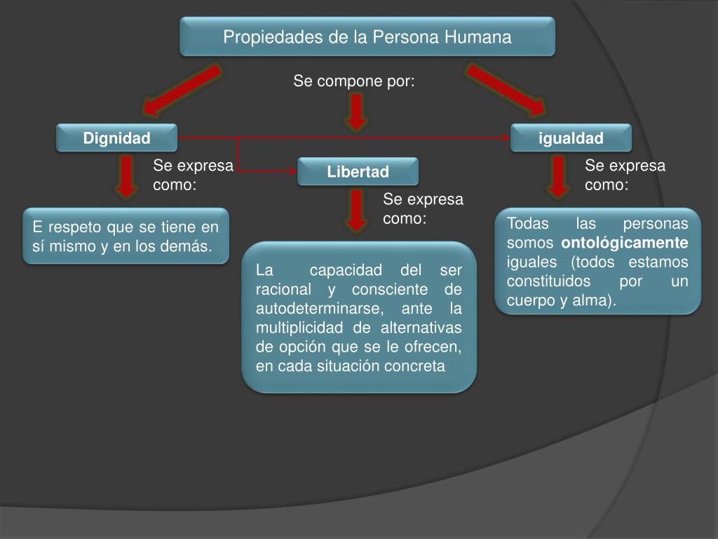 Propiedadesde la Persona Humana Se compone por: Se expresa como: Se expresa como: Se expresa como: Dignidad igualdad Libertad E respeto que se tiene en sí mismo y en los demás. Todas las personas somos ontológicamente iguales (todos estamos constituidos por un cuerpo y alma). La capacidad del ser racional y consciente de autodeterminarse, ante la multiplicidad de alternativas de opción que se le ofrecen, en cada situación concreta