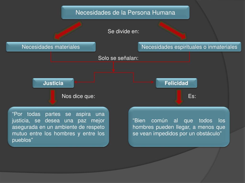 Necesidadesde la Persona Humana Se divide en: Necesidades materiales Necesidades espirituales o inmateriales Nos dice que: Es: Solo se señalan: Justicia Felicidad “Por todas partes se aspira una justicia, se desea una paz mejor asegurada en un ambiente de respeto mutuo entre los hombres y entre los pueblos” “Bien común al que todos los hombres pueden llegar, a menos que se vean impedidos por un obstáculo”