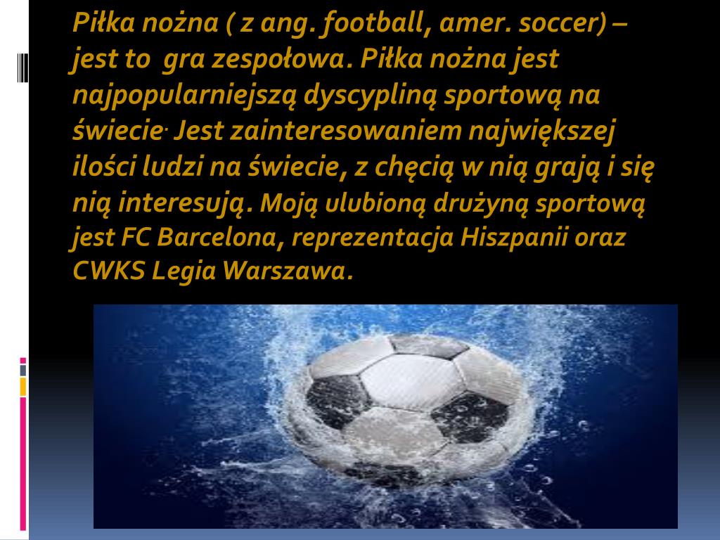 Piłka nożna ( z ang. football, amer. soccer) – jest to gra zespołowa. Piłka nożna jest najpopularniejszą dyscypliną sportową na świecie. Jest zainteresowaniem największej ilości ludzi na świecie, z chęcią w nią grają i się nią interesują. Moją ulubioną drużyną sportową jest FC Barcelona, reprezentacja Hiszpanii oraz CWKS Legia Warszawa.
