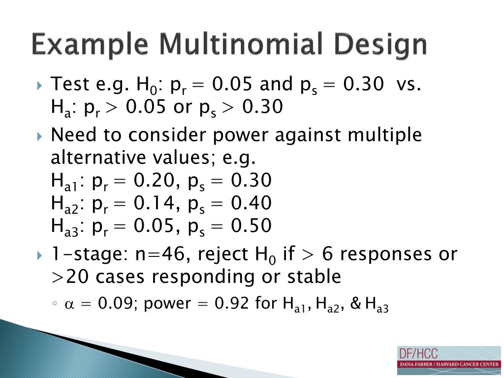 Example Multinomial Design • Test e.g. H0: pr = 0.05 and ps= 0.30 vs. Ha: pr > 0.05 or ps> 0.30 • Need to consider power against multiple alternative values; e.g. Ha1: pr = 0.20, ps= 0.30Ha2: pr = 0.14, ps= 0.40Ha3: pr = 0.05, ps= 0.50 • 1-stage: n=46, reject H0 if > 6 responses or >20 cases responding or stable • = 0.09; power = 0.92 for Ha1,Ha2, &Ha3