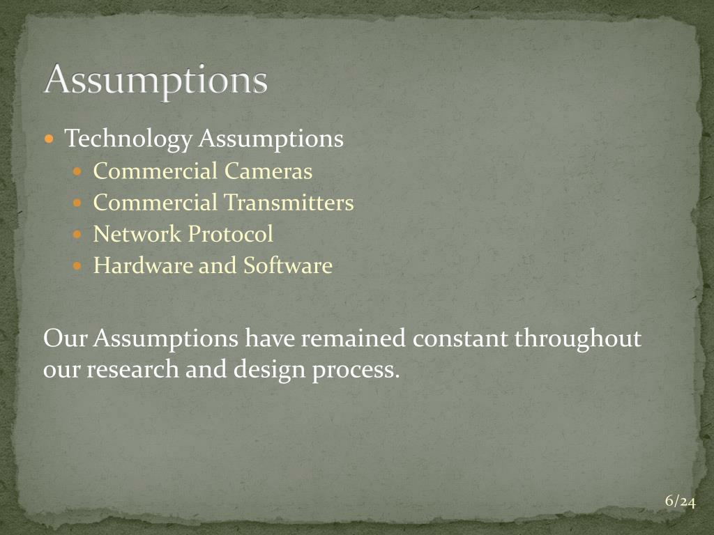 Assumptions • Technology Assumptions • Commercial Cameras • Commercial Transmitters • Network Protocol • Hardware and Software Our Assumptions have remained constant throughout our research and design process.